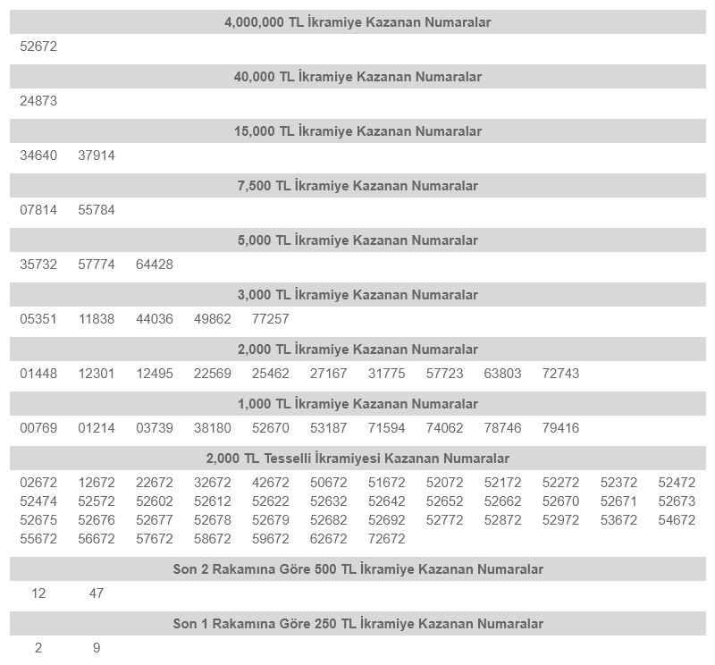 15 Ağustos 2025 tarihli Devlet Piyangosu çekilişinde 4 milyon TL’lik büyük ikramiye, Lefkoşa’da gezici bayi Işıltan Yüksel tarafından satılan “52672” numaralı bilete çıktı.