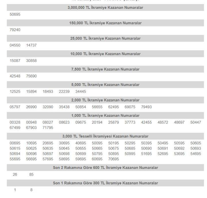 15 Ocak 2026 Devlet Piyangosu çekilişinde 3 milyon TL’lik büyük ikramiye 50695 numaralı bilete isabet etti. Bir sonraki çekiliş 30 Ocak 2026 tarihinde yapılacak ve büyük ikramiye 6 milyon TL olacak