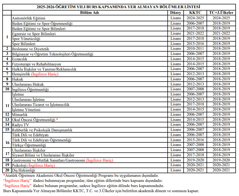2025-2026 öğretim yılında burs kapsamında yer almayan bölümlerle yüksek lisans-doktora ileri alan ve ihtiyaç alanları listesi açıklandı.