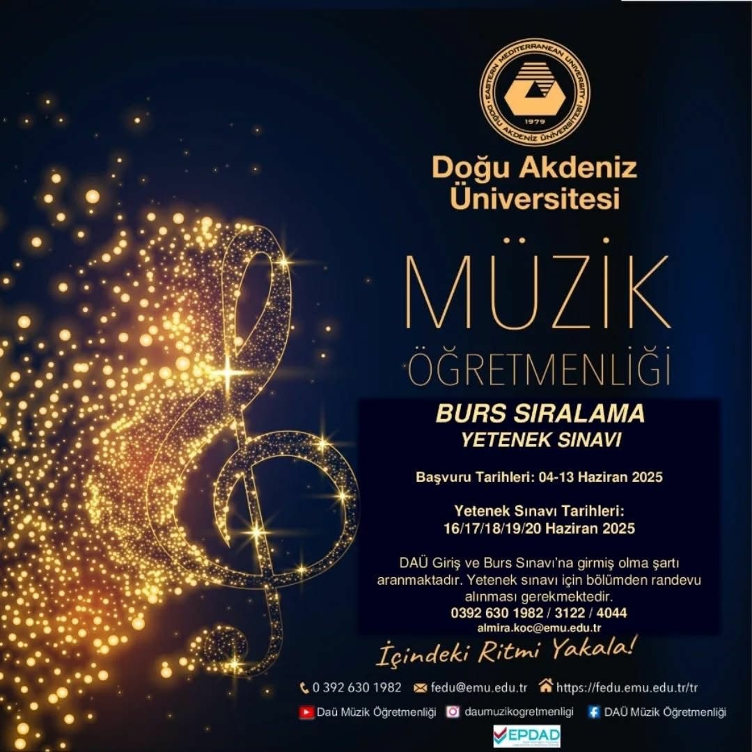 Doğu Akdeniz Üniversitesi (DAÜ) Eğitim Fakültesi, Güzel Sanatlar Eğitimi Bölümü tarafından Müzik Öğretmenliği Lisans Programı için 2025-2026 Akademik Yılı Güz Dönemi'ne yönelik burs sıralama yetenek sınavı düzenlenecek.