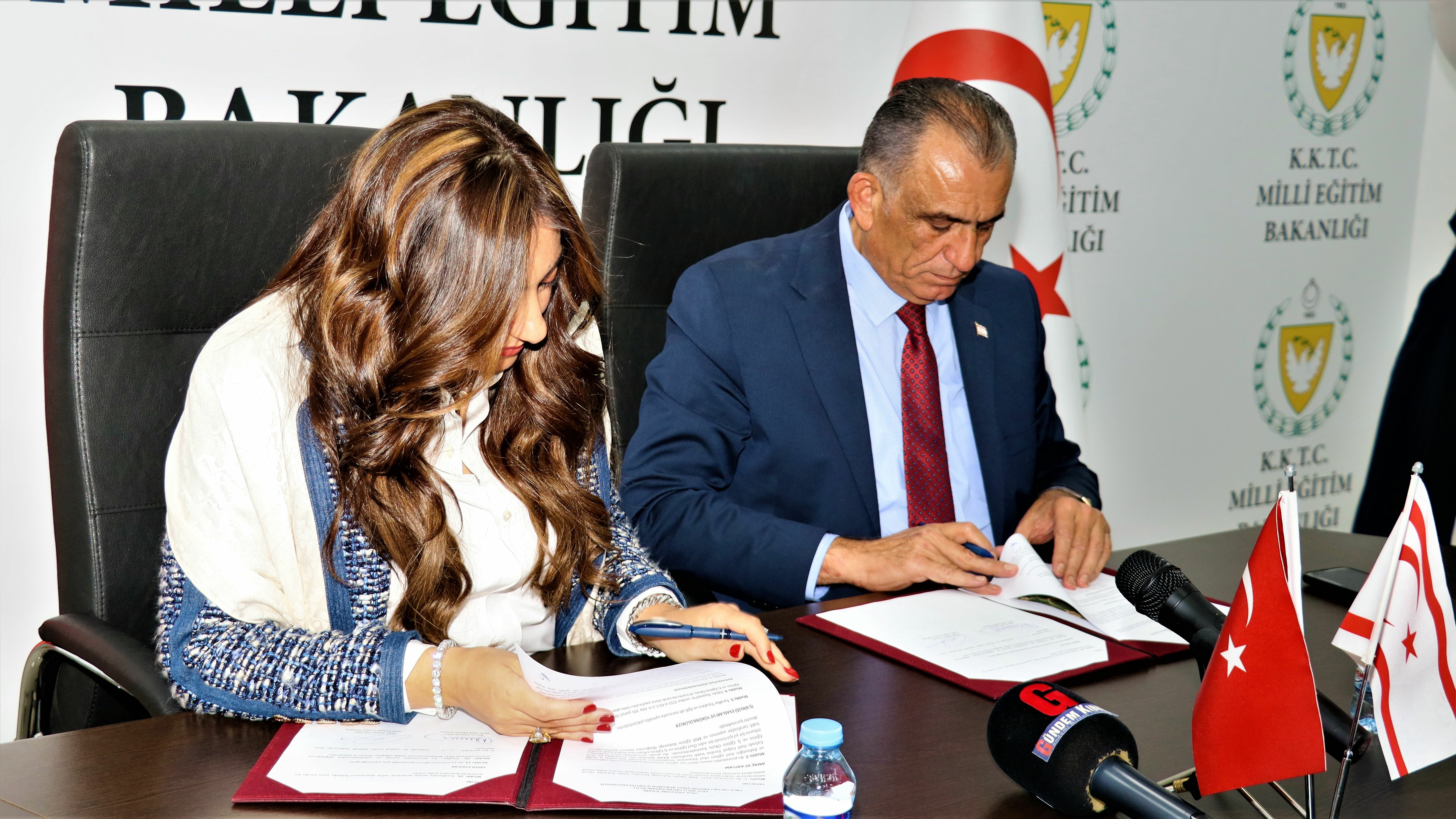 Protokole, Milli Eğitim Bakanı Nazım Çavuşoğlu ile Halil Falyalı Yardım Vakfı Başkanı Özge Taşker Falyalı imza koydu.