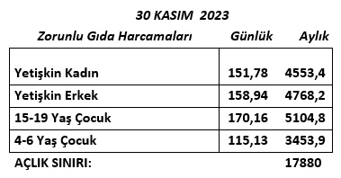 Kasım ayında yapılan hesaplamaya göre 4 kişilik bir aile için açlık sınırı 17 bin 880 Türk Lirası (TL) olarak belirlendi.