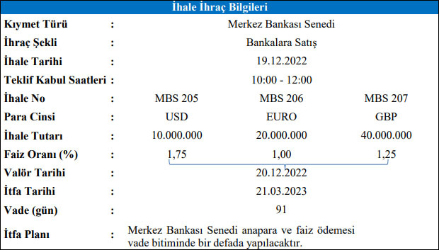 Merkez Bankası’ndan yapılan açıklamada, Merkez Bankası Senetleri İhalelerine Katılım Esasları çerçevesinde, 19 Aralık 2022 günü Merkez Bankası senetlerinin ihracının gerçekleştirileceği açıklandı.