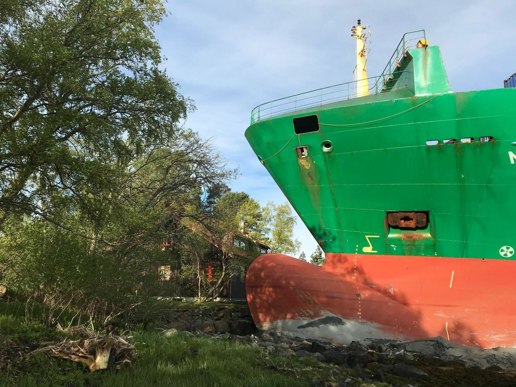 Güney Kıbrıs bayraklı 135 metrelik yük gemisi, Norveç'in Trondheim kentinde yaşayan bir kişinin evinin bahçesinde karaya oturdu.
