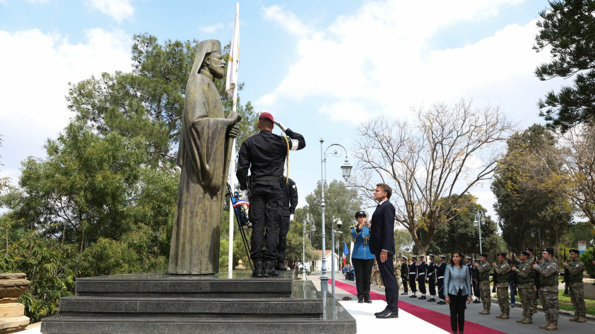 Macron, Cumhurbaşkanlığı Sarayı’nda düzenlenen resmi törenle karşılandı. Milli marşların okunmasının ardından Başpiskopos Makarios III'ün heykeline çelenk bırakıldı. Daha sonra iki lider arasında baş başa görüşme gerçekleştirildi.