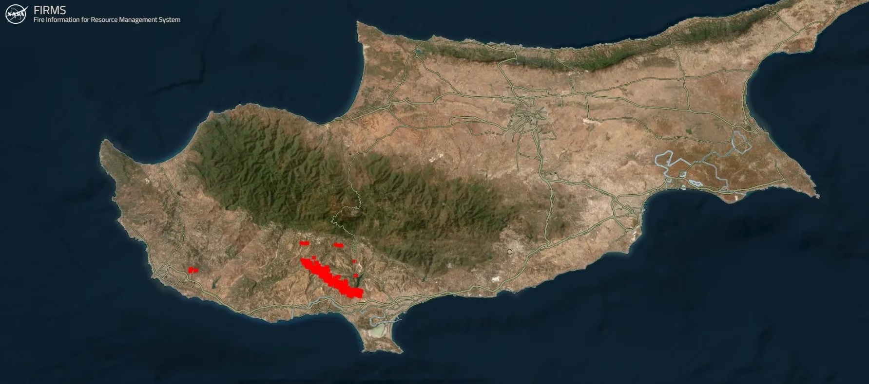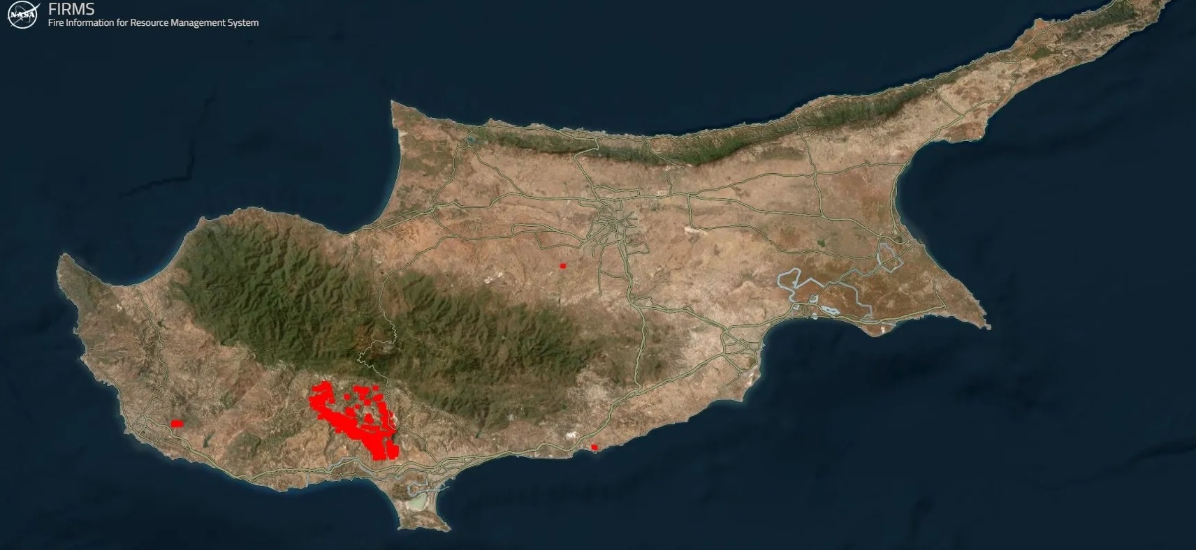 Alphanews haber sitesi, NASA'nın Kıbrıs adasındaki yangınların dün ve bugünkü görüntülerine yer verdiği haberinde, dün itibarıyla özellikle Limasol'un dağlık ve güney kesimlerde geniş bir alanın kırmızı noktalarla işaretlendiğine dikkat çekti. Habere göre bu noktalar, ölümcül yangınların aktif olarak sürdüğü bölgeleri temsil ediyor.