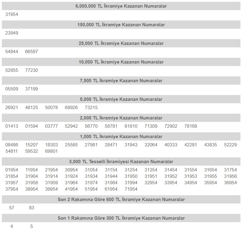 Yapılan çekiliş sonucunda 6 milyon TL’lik büyük ikramiye, “31954” numaralı bilete isabet etti. Şanslı biletin, Akdoğan bayisi Süleyman Özulu tarafından satıldığı açıklandı.