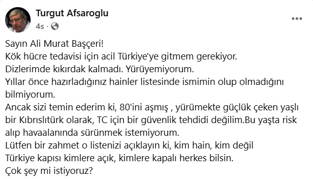 Kıbrıs Türk Öğretmenler Sendikası (KTÖS) kurucularından, emekli öğretmen ve yazar Turgut Afşaroğlu, kişisel sosyal medya hesabından, Türkiye Cumhuriyeti Lefkoşa Büyükelçisi Ali Murat Başçeri’ye hitaben bir paylaşım yaptı.