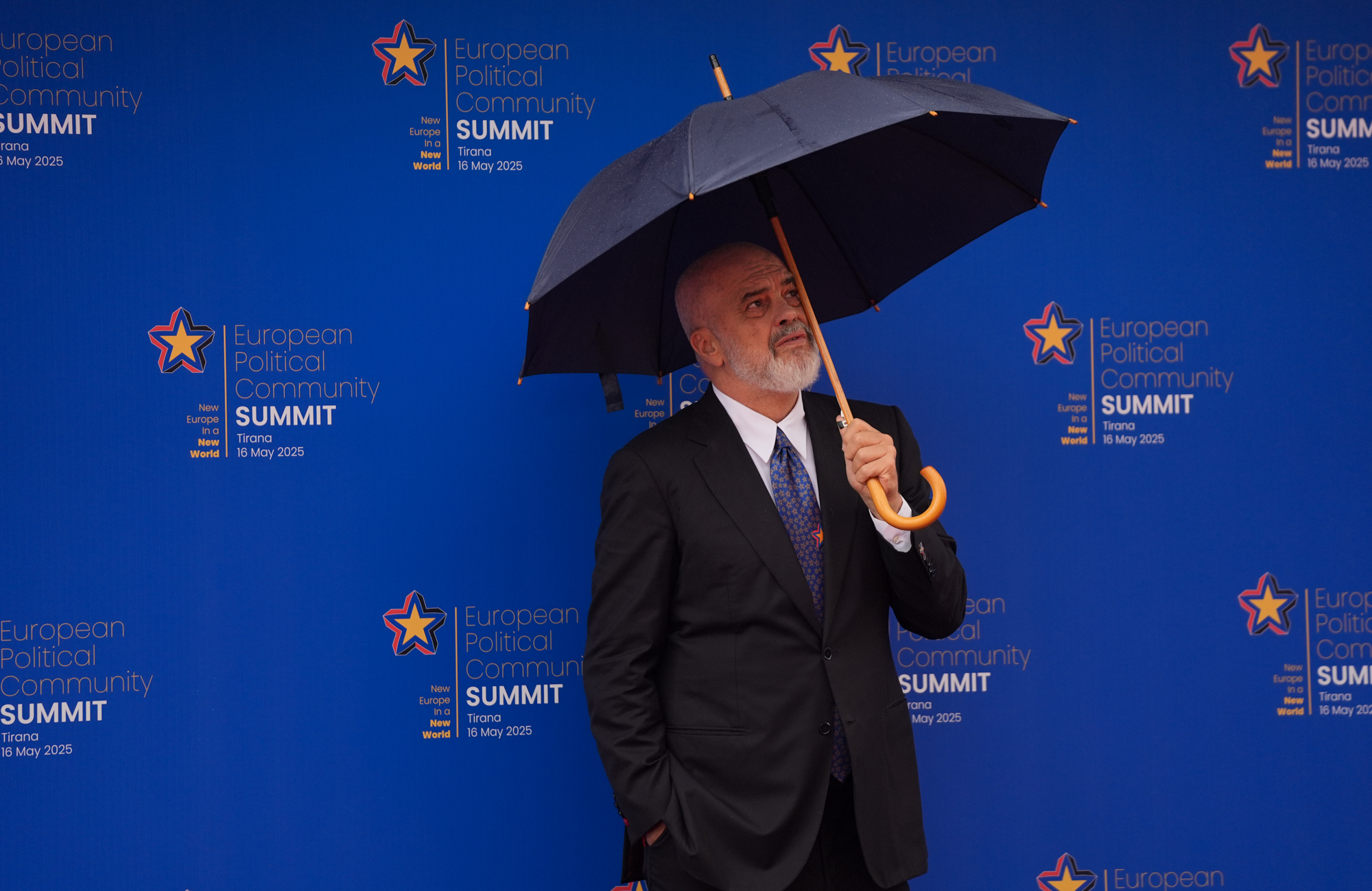 Rama tüm liderleri olduğu gibi İtalya Başbakanı Meloni'yi de kırmızı halı da karşıladı. Ancak elindeki şemsiyeyi kenara bırakıp dizi üzerine çöken Edi Rama, Meloni'yi bu şekilde karşıladı.