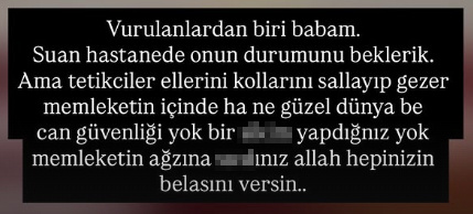 Duran yaptığı paylaşımda “Vurulanlardan biri babam. Şu anda hastanede onun durumunu bekliyoruz. Ama tetikçiler ellerini kollarını sallayarak geziyor memleketin içinde. Ne güzel dünya, can güvenliği yok.” ifadelerini kullandı.