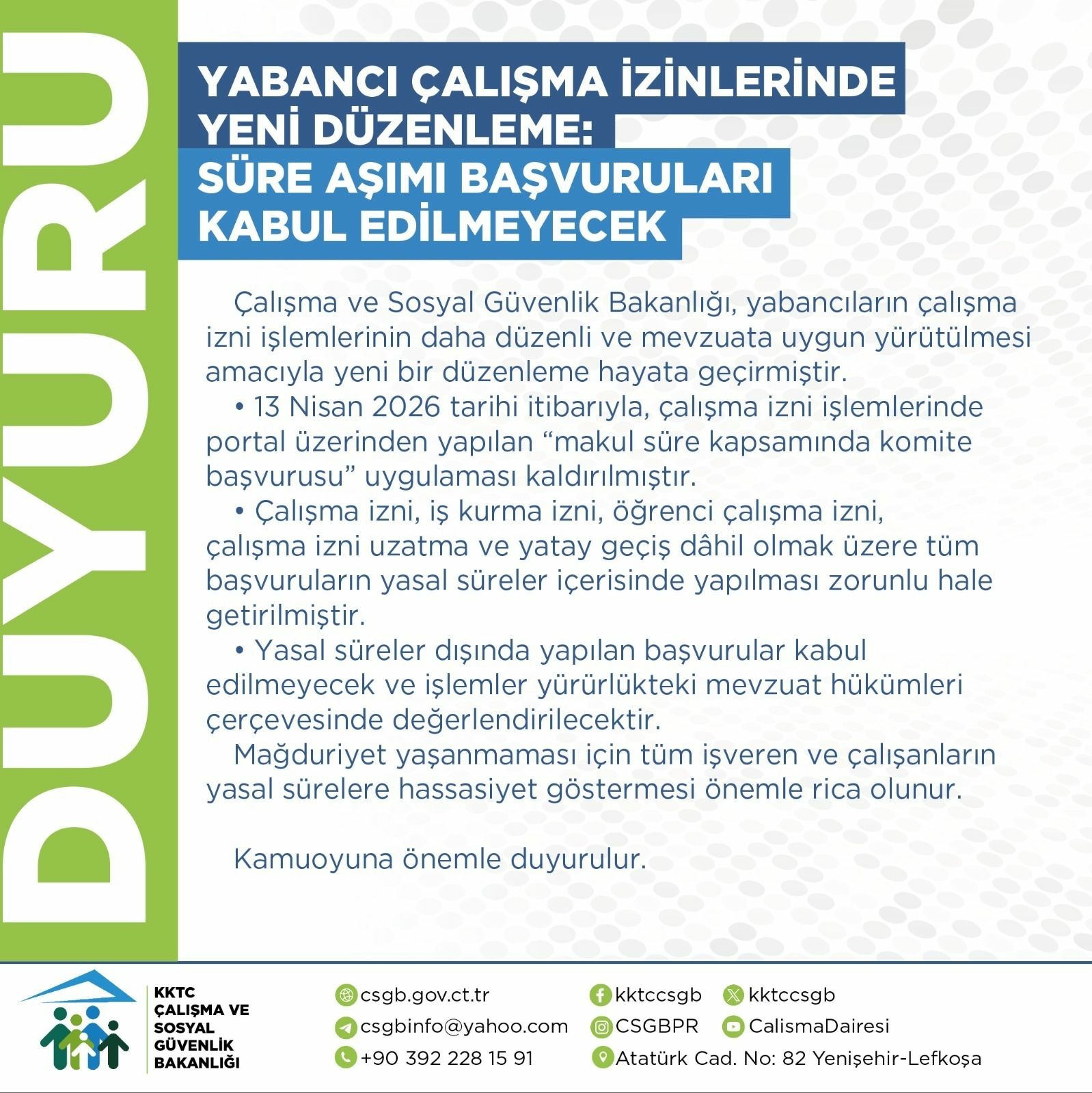 Söz konusu kararla birlikte 13 Nisan 2026 itibarıyla "makul süre kapsamında komite başvurusu" uygulaması tamamen kaldırılacak. Çalışma izni, iş kurma izni, öğrenci çalışma izni, uzatma ve yatay geçiş dahil tüm başvuruların yasal süre içinde yapılması zorunlu olacak; süresi dışında yapılan başvurular kabul edilmeyecek ve mevcut mevzuat hükümlerine göre işlem yapılacaktır.