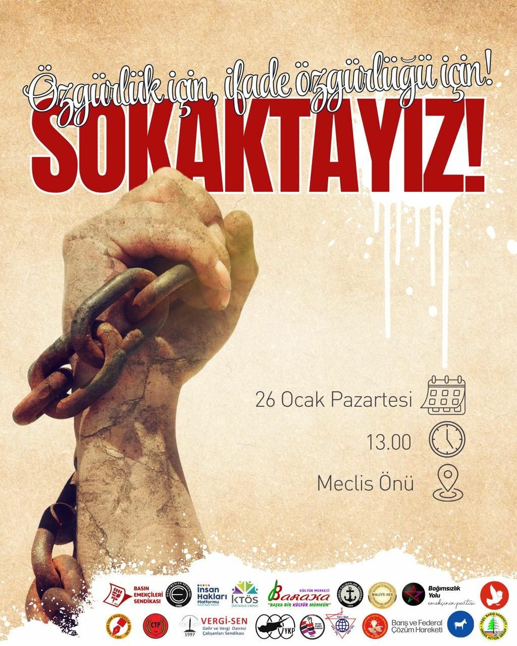 Eyleme; Kıbrıs Türk Gazeteciler Birliği (KTGB), Basın Emekçileri Sendikası (Basın-Sen), İnsan Hakları Platformu (İHP), Kıbrıs Türk Öğretmenler Sendikası (KTÖS), Kıbrıs Türk Orta Eğitim Öğretmenler Sendikası (KTOEÖS), Baraka Kültür Merkezi, Gelir ve Vergi Dairesi Çalışanları Sendikası (Vergi-Sen), Gümrük Çalışanları Sendikası (Güç-Sen), Hazine ve Maliye Çalışanları Sendikası (Maliye-Sen), Eşit Hak ve Adalet Sendikası (HAKSEN), Bağımsızlık Yolu (BY), Toplumcu Demokrasi Partisi (TDP), Cumhuriyetçi Türk Partisi (CTP), Kıbrıs Türk Elektrik Kurumu Çalışanları Sendikası (El-Sen), Liberal Demokrasi Hareketi (LDH), Yeşil Barış Hareketi (YBH), Kıbrıs Türk Kamu, Ulaştırma, Haberleşme, Bilişim Teknolojileri ve Telekomünikasyon Çalışanları Sendikası (Tel-Sen), Yeni Kıbrıs Partisi (YKP) ve Barış ve Federal Çözüm Hareketi destek verecek.