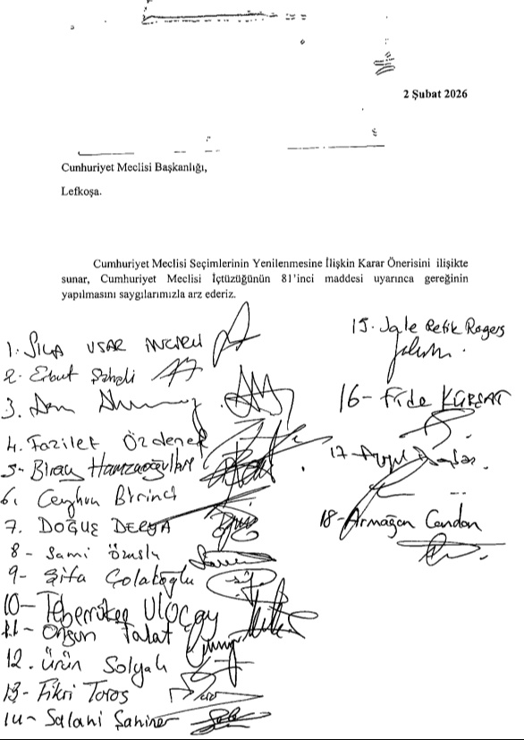 Karar önerisinde, “Kuzey Kıbrıs Türk Cumhuriyeti Cumhuriyet Meclisi seçimlerinin Anayasa’nın 88’inci maddesinin 1'inci fıkrası uyarınca seçim dönemi sona ermeden yenilenmesi ve seçimin 26 Nisan 2026 tarihinde yapılması” talep edildi.