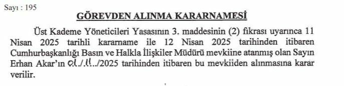Cumhurbaşkanlığı Basın ve Halk İlişkiler Müdürü Erhan Akar ile Danışmanlık ve Siyasi İşler Müdürü Gamze Mahirel Bozatlı görevlerinden alındı. Kararlar, bugünkü Resmi Gazete'de yayımlandı.