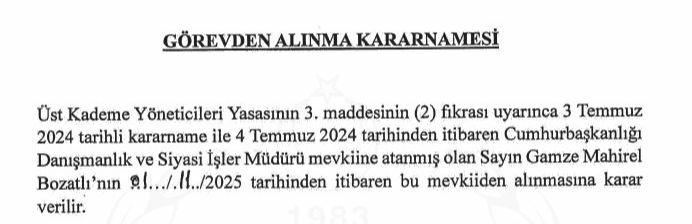 Resmi Gazete'nin bugünkü sayısında yayımlanan karara göre, Basın ve Halk İlişkiler Müdürü Erhan Akar ile Danışmanlık ve Siyasi İşler Müdürü Gamze Mahirel Bozatlı'nın görevlerine 1 Kasım 2025 tarihinden itibaren son verildi.