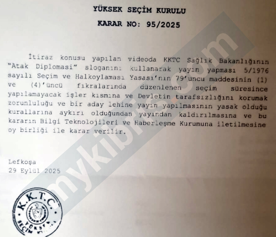 YSK aldığı 95/2025 sayılı kararda, söz konusu videonun "5/1976 sayılı Seçim ve Halkoylaması Yasası'nın 79'uncu maddesinin (1) (4)'üncü fıkralarında düzenlenen seçim süresince yapılamayacak işler kısmına ve devletin tarafsızlığını korumak zorunluluğu ve bir aday lehine yayın yapılmasının yasak olduğu kurallarına aykırı olduğunu" bu nedenle kaldırılmasına hükmetti.