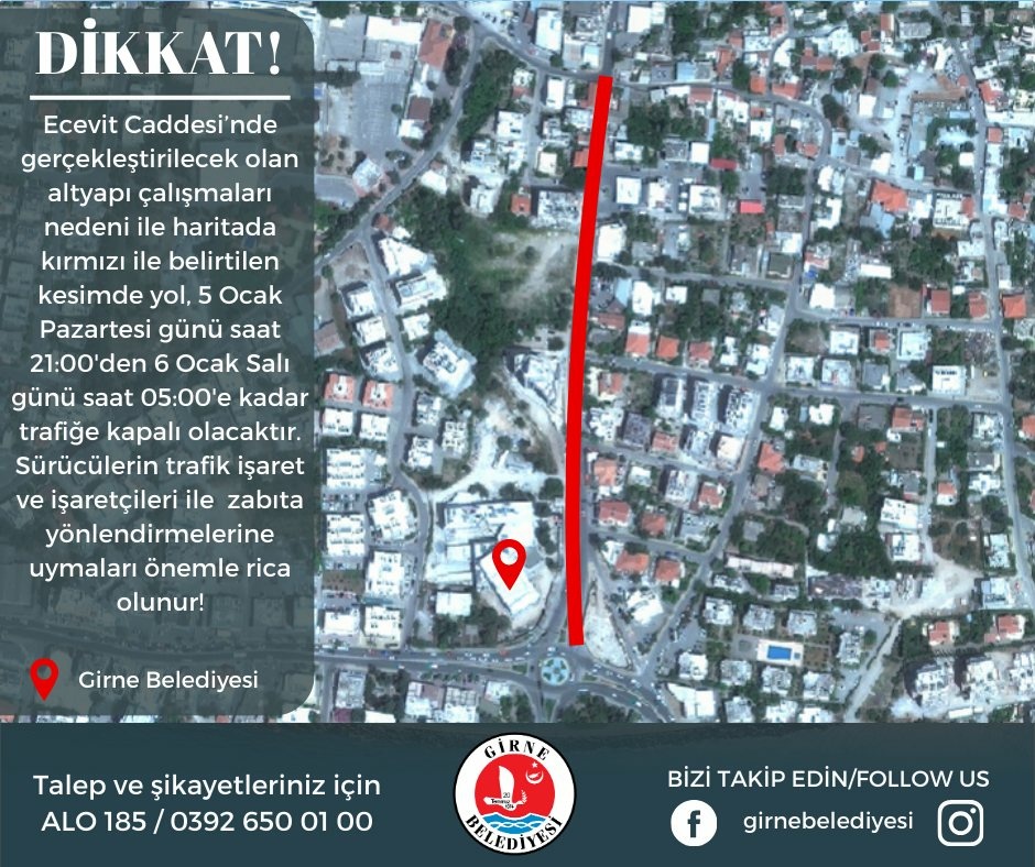 Girne Ecevit Caddesi, altyapı çalışmaları nedeniyle bu akşam saat 21.00'den, yarın sabah 05.00'e kadar trafiğe kapalı olacak.
