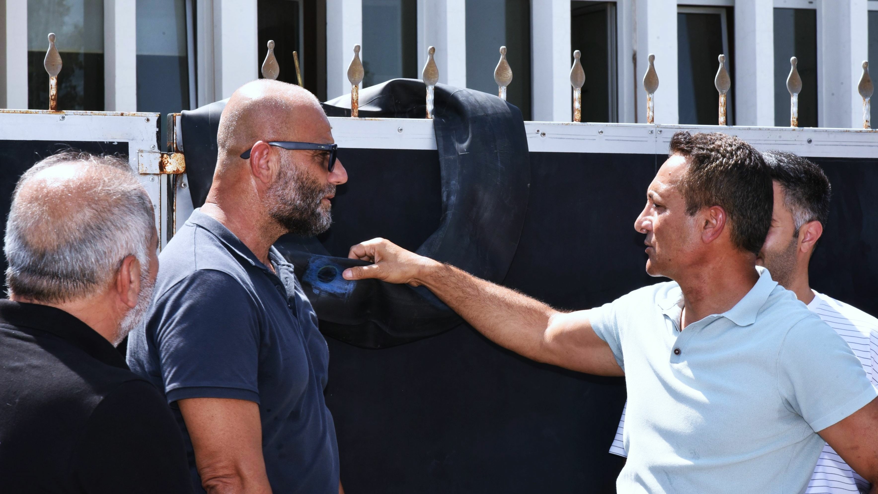 KTOEÖS üyeleri, protesto amacıyla Başbakanlık kapısına "yamalı araba tekerleği iç lastiği" astı.