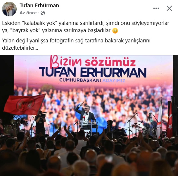 CTP lideri ve cumhurbaşkanı adayı Erhürman, dün akşamki etkinlikte yer alan KKTC ve Türk bayraklarının olduğu fotoğrafı paylaşarak, "Bayrak yok' yalanına sarılanlar fotoğrafın sağına bakabilirler" dedi.