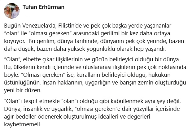Erhürman, Venezuela, Filistin ve dünyanın birçok yerinde yaşananların “olan” ile “olması gereken” arasındaki gerilimi yeniden görünür kıldığını belirtti.