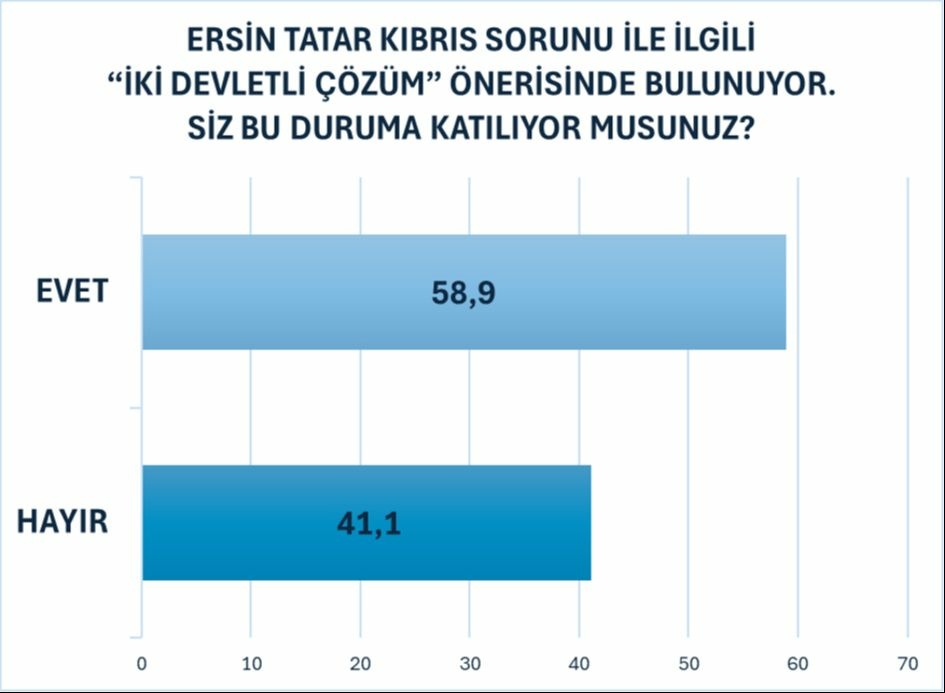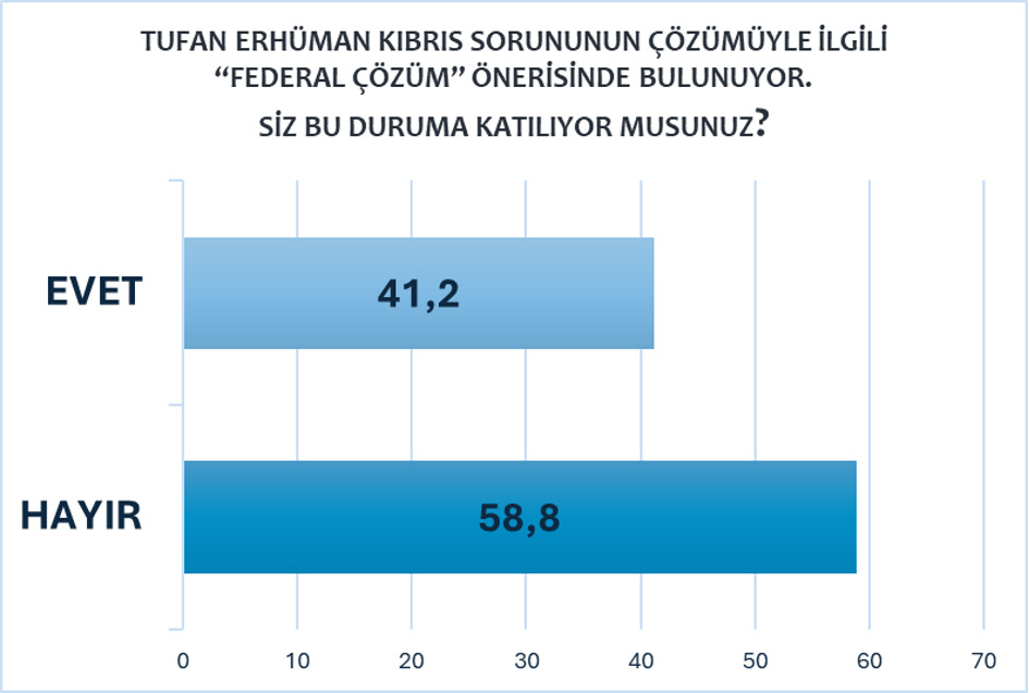 UBP Cumhurbaşkanı adayı Ersin Tatar, iki devletli çözümü savunuyor ve seçmenin yüzde 58,9'u bu görüşü destekliyor. CTP adayı Tufan Erhürman ise federasyonu çözüm olarak görüyor ve yüzde 41,1'lik kesim federasyonu destekliyor.