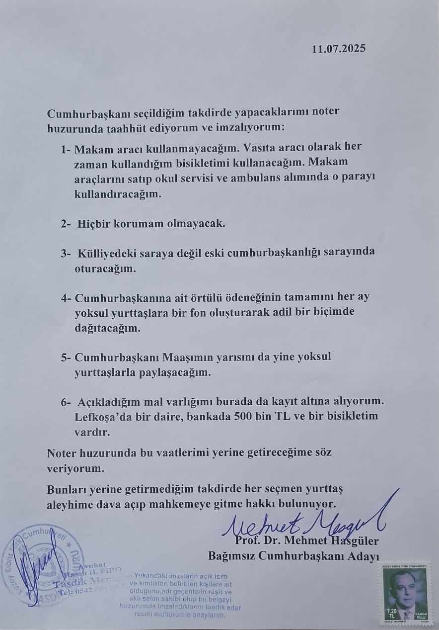 Bağımsız Cumhurbaşkanı adayı Prof. Dr. Mehmet Hasgüler makam araçlarını satacağını, bisiklet kullanacağını, külliyeye taşınmayacağını, korumasız olacağını, maaşının yarısını yoksullara vereceğini noter huzurunda imzalayarak taahhüt etti.