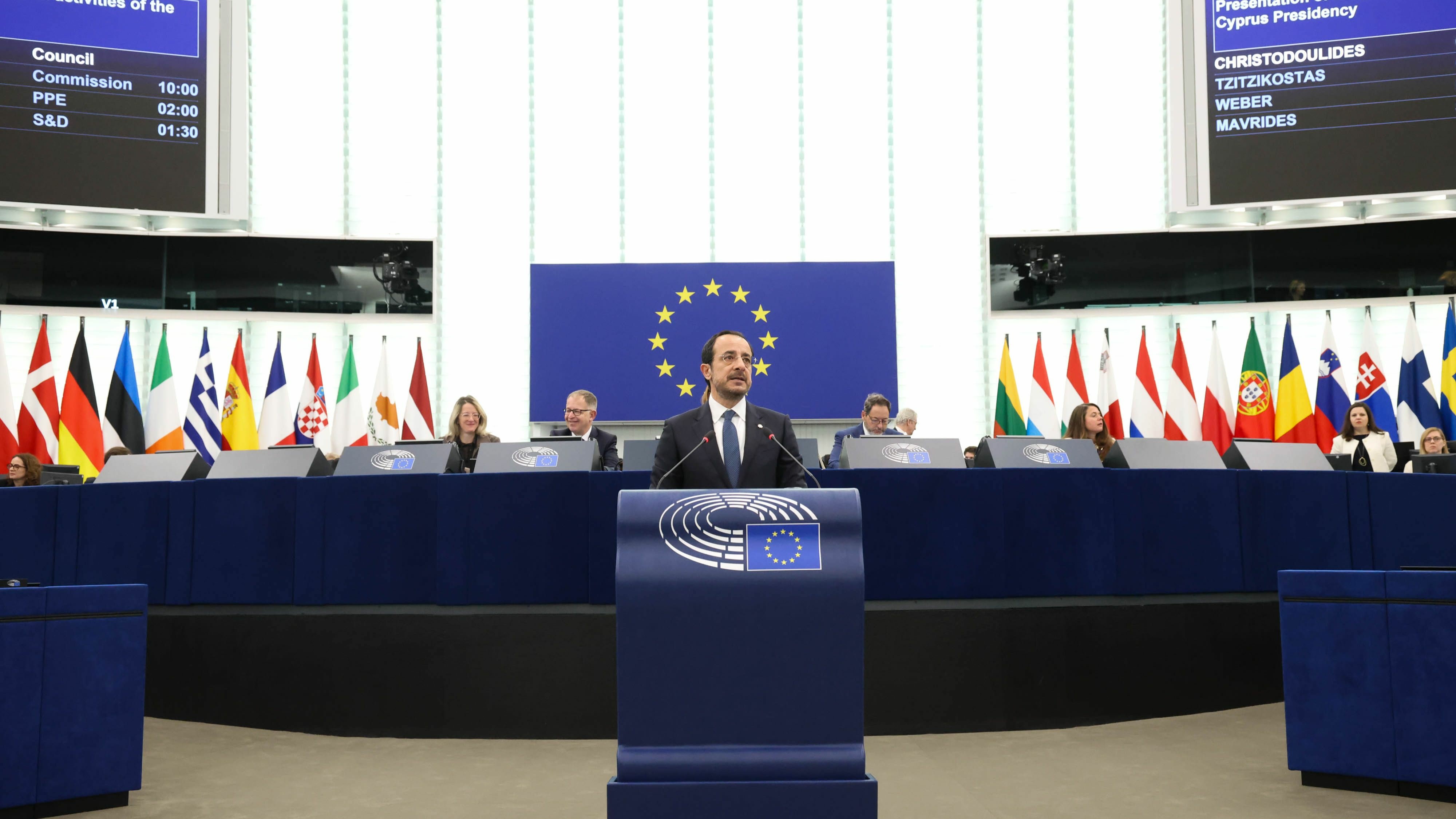 Güney Kıbrıs Rum Yönetimi (GKRY) Başkanı Nikos Hristodulidis, Strasburg'da bulunan Avrupa Parlamentosu'nda Güney Kıbrıs'ın AB Dönem Başkanlığı’nın önceliklerini sundu.