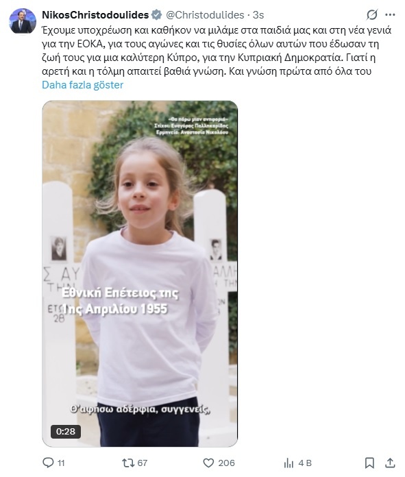 Rum Yönetimi Başkanı Nikos Hristodulidis, terör örgütü EOKA’nın silahlı eyleme başladığı 1 Nisan 1955’in yıl dönümü nedeniyle X platformundaki hesabından mesaj yayımladı.