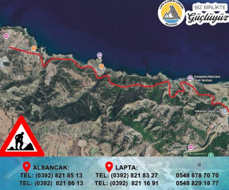 Lapta Alsancak Çamlıbel Belediyesi, Kayalar–Sadrazamköy güzergahında yapılacak asfaltlama çalışması nedeniyle sürücüleri dikkatli olmaları konusunda uyardı.