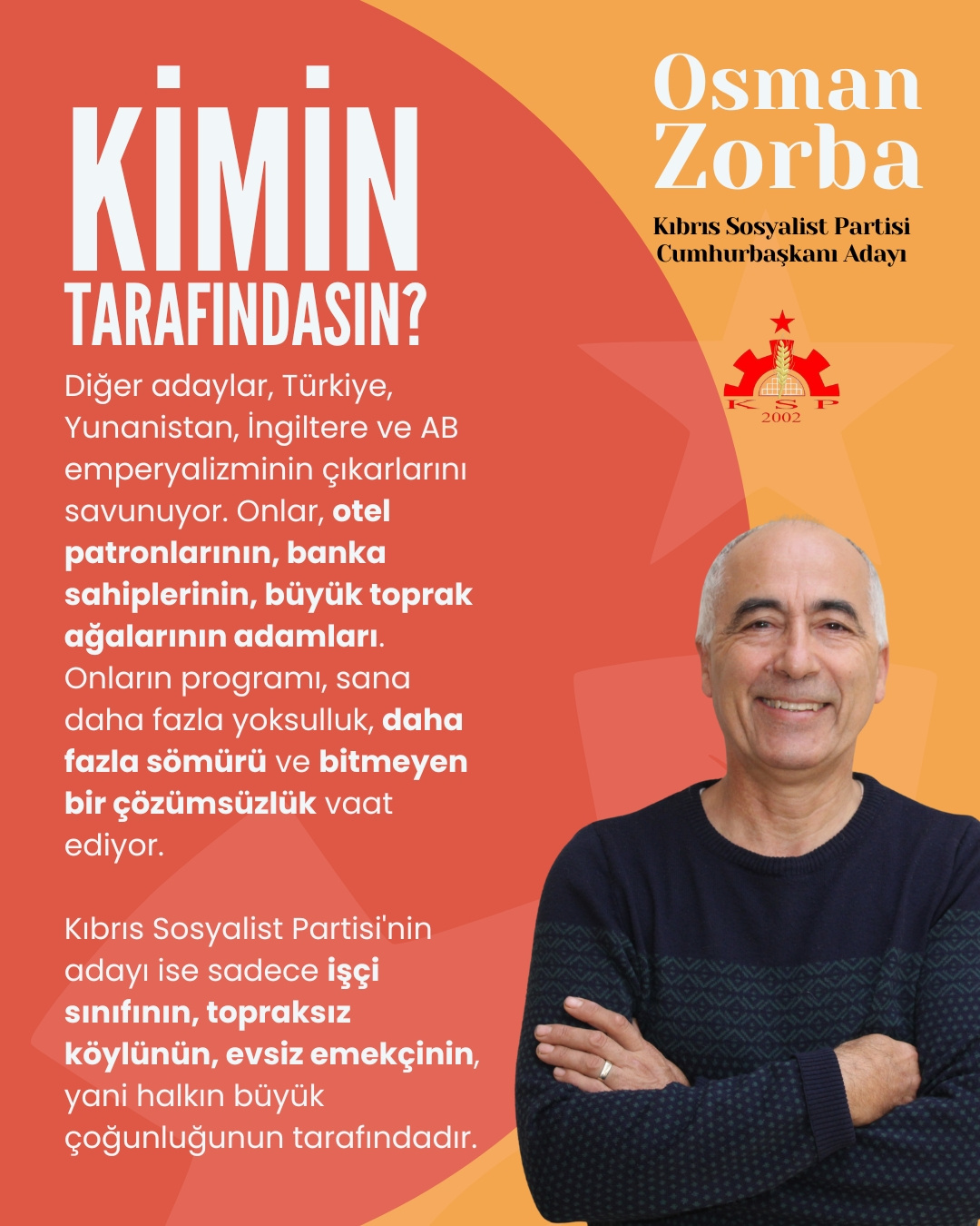 Cumhurbaşkanlığı seçimlerinde adayları Osman Zorba'ya destek isteyen Kıbrıs Sosyalist Partisi, programlarının işçi sınıfı, köylü ve emekçilerden yana olduğunu vurgulayarak, programlarında yabancı üslere ve askeri garantilere yer olmadığını belirtti.