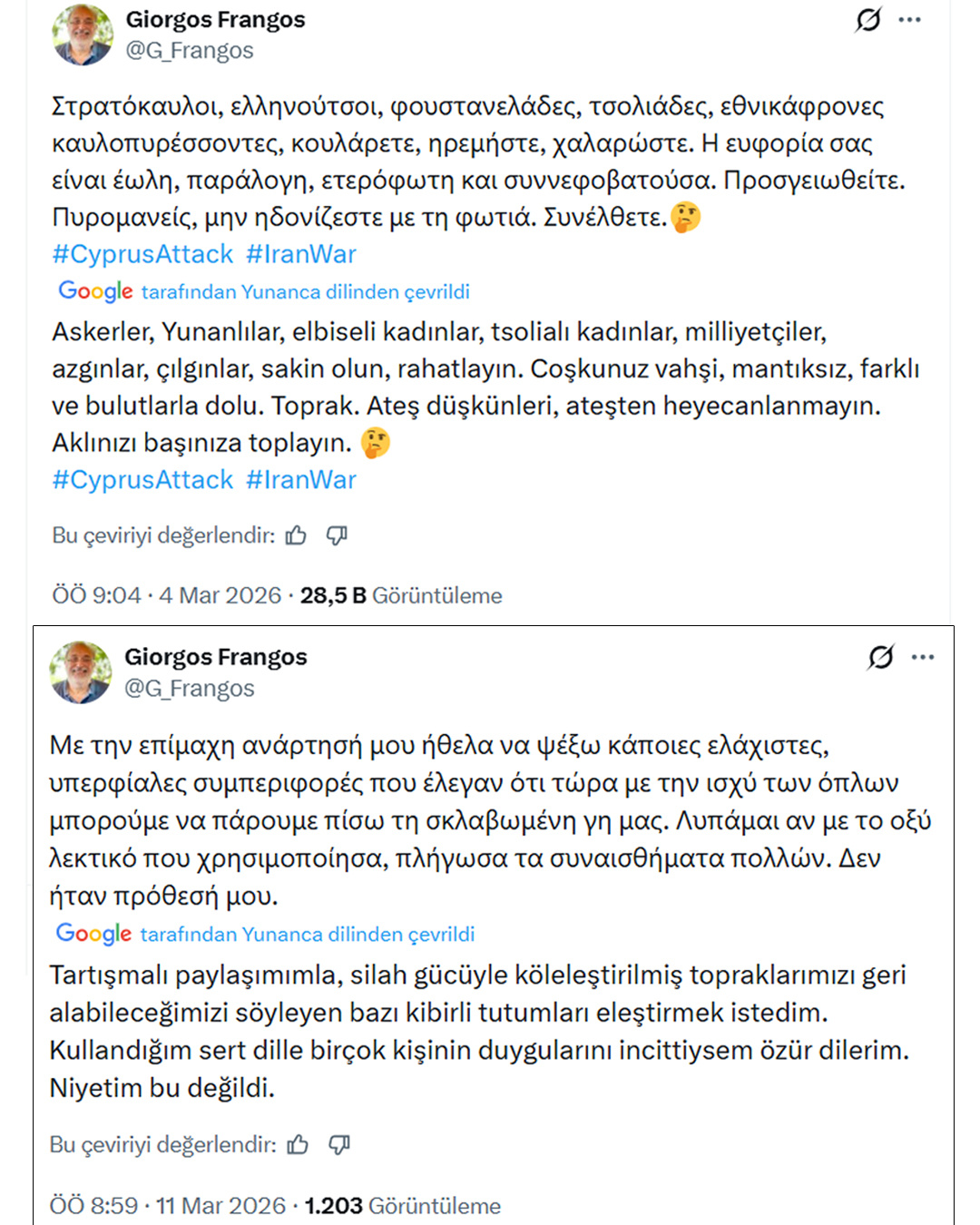 Frangos, 4 Mart’taki paylaşımında, Yunan uçak ve gemilerinin Kıbrıs'a gelişine verilen tepkilerle ilgili olarak şunları yazmıştı: