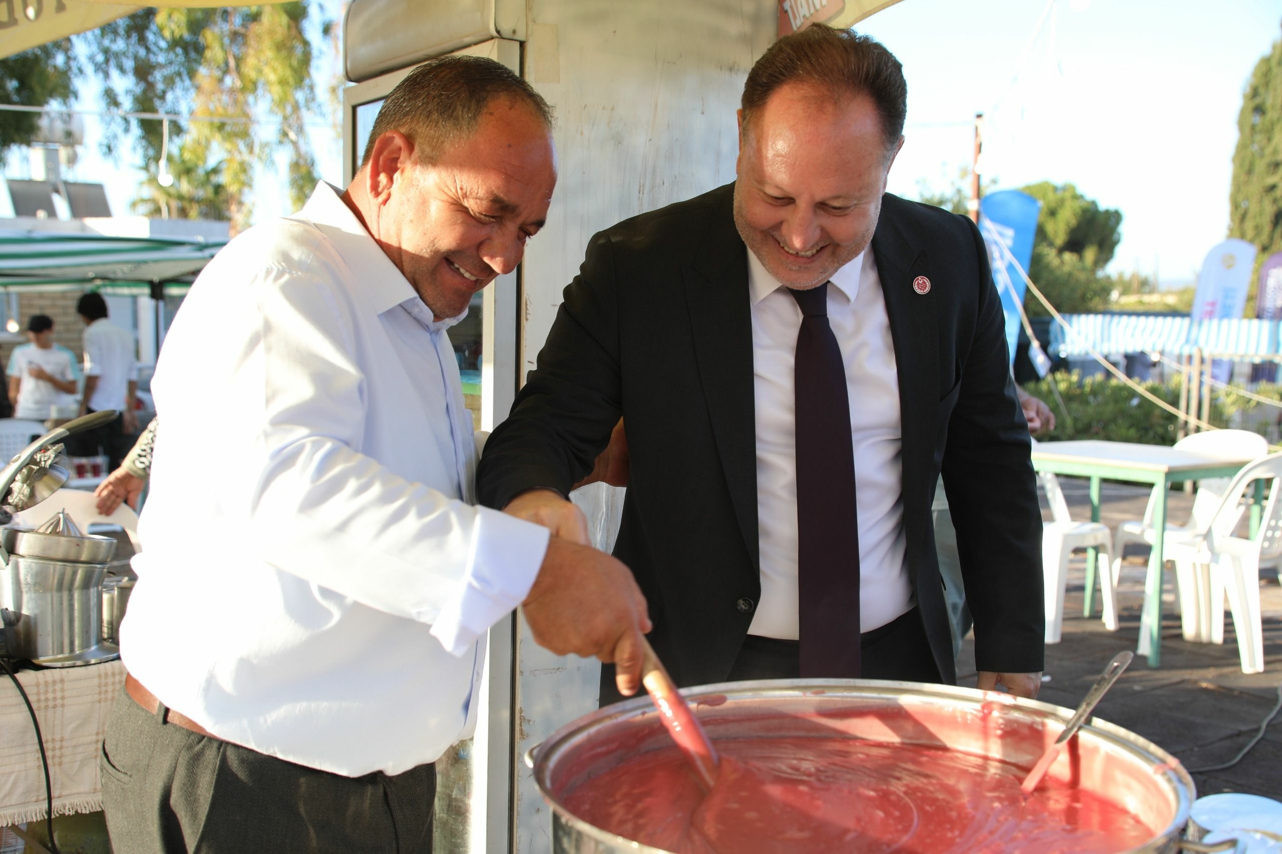 Öztürkler, panayır alanında stantları gezip esnafla sohbet ederken, nar paluzesi kaynattı ve tadına baktı. Etkinlikte Güneşköy Muhtarı Akay Darbaz da yer aldı.