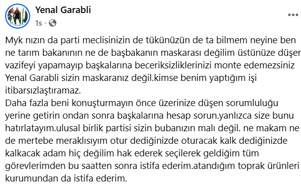 Garabli, istifasını kişisel sosyal medya hesabından yaptığı sert ifadeler içeren paylaşımla duyurdu.