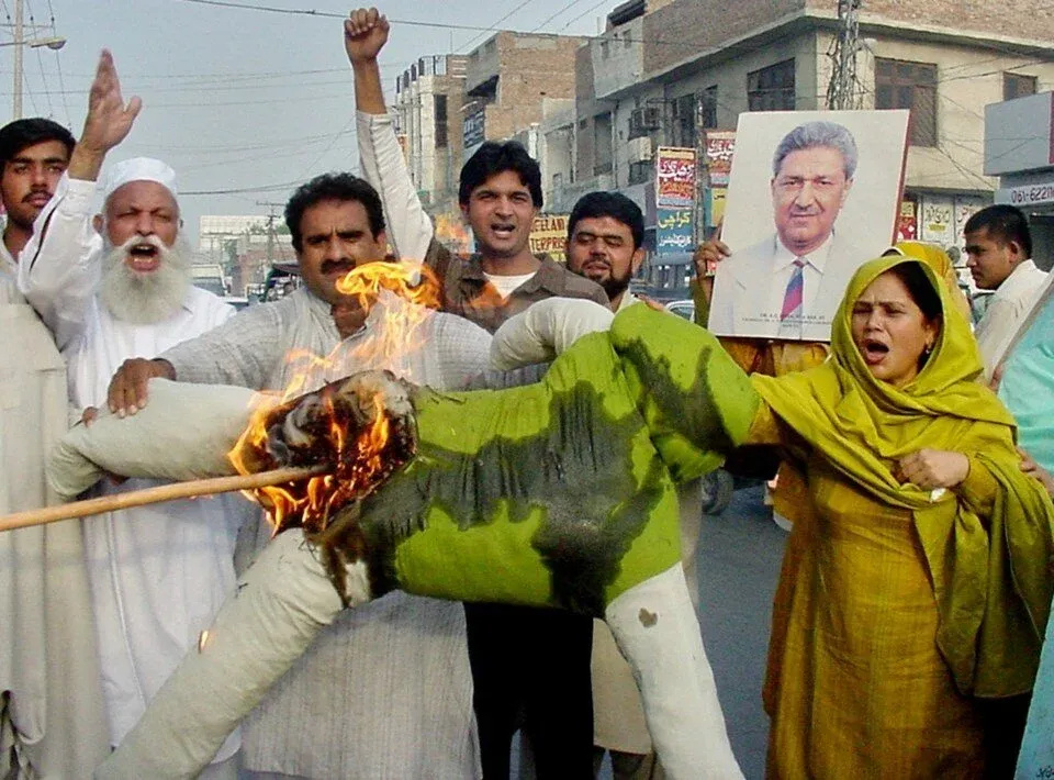 Aktivistler, ev hapsinde tutulduğu sırada Abdul Kadir Han'ın bir fotoğrafını tutarken Başbakan Pervez Müşerref'in büstünü yakıyorlarAktivistler, ev hapsinde tutulduğu sırada Abdul Kadir Han'ın bir fotoğrafını tutarken Başbakan Pervez Müşerref'in büstünü yakıyorlar