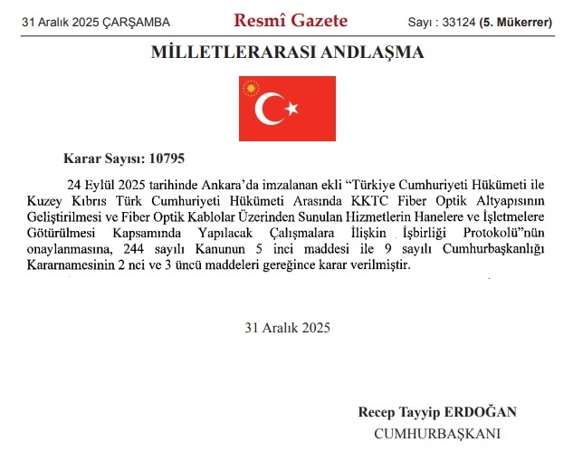 Ülkede tartışmalara neden olan, Türkiye ile Kuzey Kıbrıs Türk Cumhuriyeti (KKTC) arasında fiber optik altyapının geliştirilmesi, fiber optik kablolar üzerinden sunulan hizmetlerin hanelere ve işletmelere ulaştırılmasını amaçlayan iş birliği protokolü, TC Resmi Gazete'de yayımlandı.