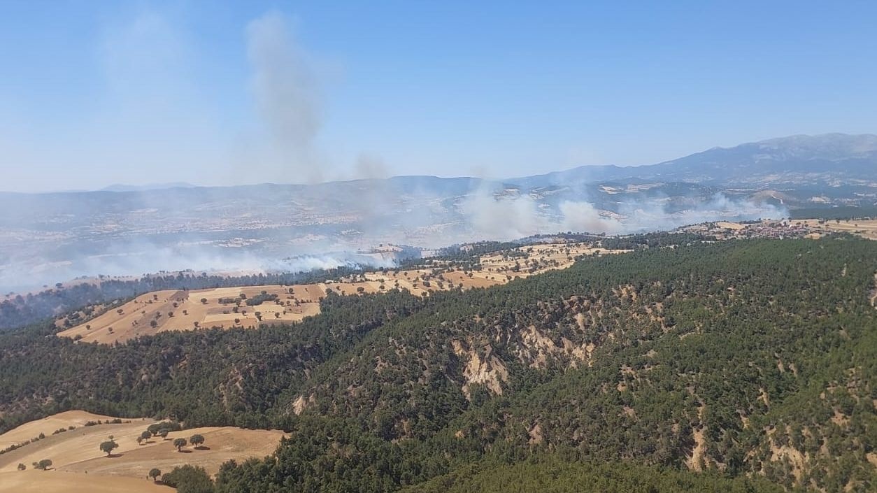 Ekili tarım arazilerine de sıçrayan yangını söndürmek için havadan ve karadan müdahale sürüyor.