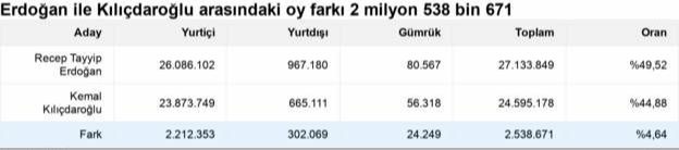 - Recep Tayyip Erdoğan: 27 milyon 133 bin 849 oy - Yüzde 49,52