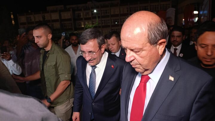 Yakın Doğu Üniversitesi Büyük Kütüphane önünde düzenlenen resepsiyona, Cumhurbaşkanı Ersin Tatar ve Türkiye Cumhuriyeti (TC) Cumhurbaşkanı Yardımcısı Cevdet Yılmaz da katıldı.
