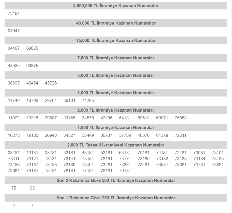 4 milyon TL tutarındaki büyük ikramiye 73181 numaralı bilete isabet etti. Şanslı biletin, Lefkoşa bölgesinde gezici bayi olarak görev yapan Murat Yayman tarafından satıldığı belirtildi.