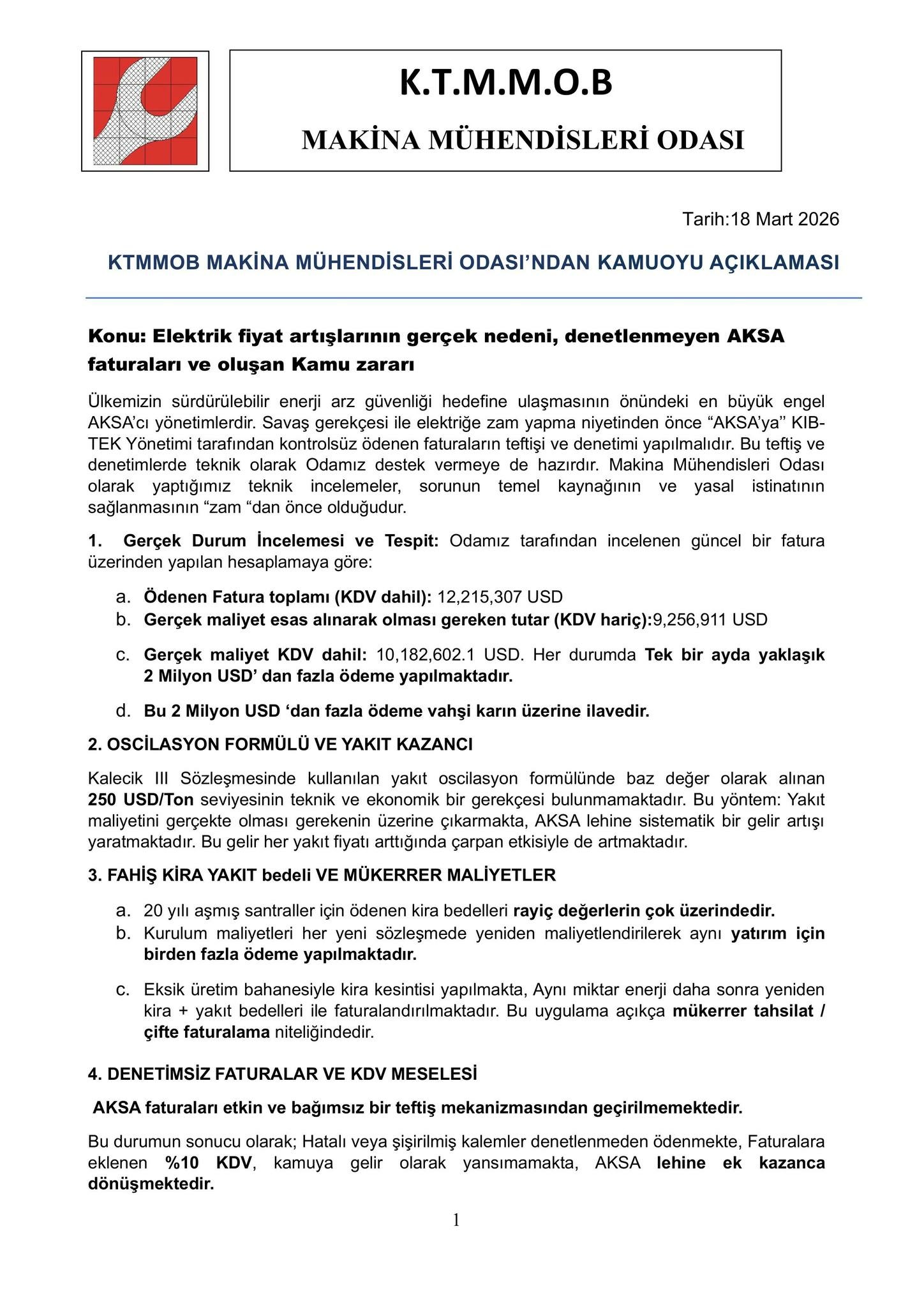Makine Mühendisleri Odası, elektriğe zam yerine AKSA'ya yapılan ödemelerin bağımsız denetime açılmasını ve yüksek kazanç vergisi alınmasını istedi; aylık faturada 2 milyon doları aşan "fazla ödeme" iddiasında bulundu.