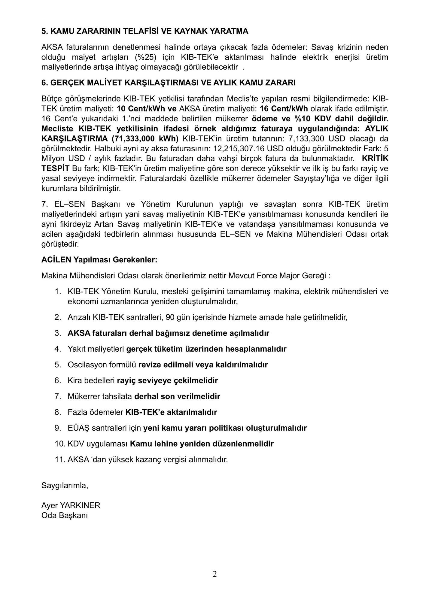 "Kıb-Tek Yönetim Kurulu, mesleki gelişimini tamamlamış makine, elektrik mühendisleri ve ekonomi uzmanlarınca yeniden oluşturulmalıdır. Arızalı Kıb-Tek santralleri, 90 gün içerisinde hizmete amade hale getirilmelidir. AKSA faturaları derhal bağımsız denetime açılmalıdır. Yakıt maliyetleri gerçek tüketim üzerinden hesaplanmalıdır. Oscilasyon formülü revize edilmeli veya kaldırılmalıdır. Kira bedelleri rayiç seviyeye çekilmelidir. Mükerrer tahsilata derhal son verilmelidir. Fazla ödemeler Kıb-Tek’e aktarılmalıdır. EÜAŞ santralleri için yeni kamu yararı politikası oluşturulmalıdır. KDV uygulaması kamu lehine yeniden düzenlenmelidir. AKSA‘dan yüksek kazanç vergisi alınmalıdır."