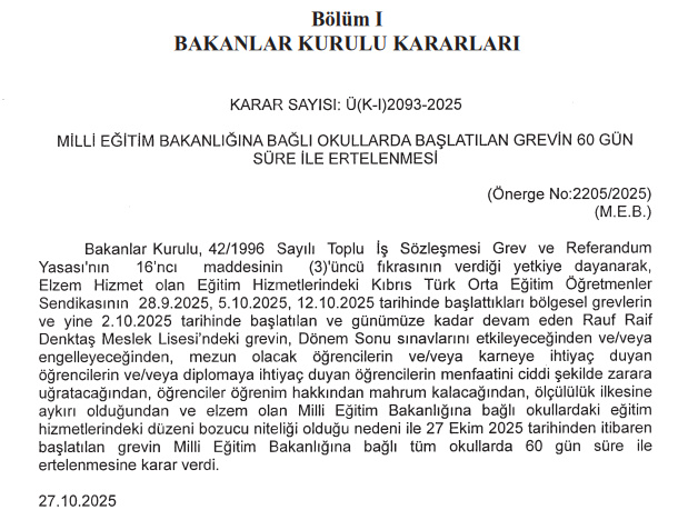 Bakanlar Kurulu, KTOEÖS'ün okullarda başlattığı grevleri 60 gün süreyle erteleme kararı aldı. Kararda, grevlerin dönem sonu sınavlarını ve öğrencilerin mezuniyet süreçlerini olumsuz etkilediği vurgulandı.