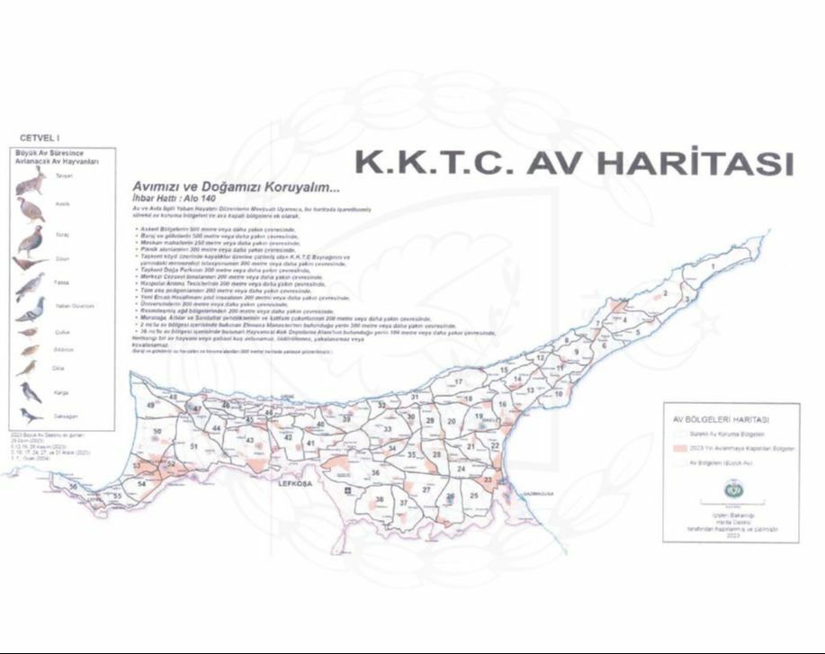 Büyük Av Mevsiminde Büyük Av haritasında işaretlenmiş sürekli av koruma bölgeleri ve ava kapalı bölgelere ek olarak "Baraj ve göletlerin 500 metre, meskun mahallerin 250 metre, piknik alanlarının 300 metre, Taşkent köyü üzerinde kayalıklara çizilmiş KKTC bayrağının 200 metre, Taşkent Doğa Parkının 200 metre, Merkezi Cezaevi binalarının 200 metre, Haspolat Arıtma Tesislerinin 200 metre, tüm atış poligonlarının 200 metre, Yeni Ercan Havalimanı pisti 200 metre, üniversitelerin 200 metre, resmileşmiş ağıl bölgelerinin 200 metre, Muratağa, Atlılar ve Sandallar şehitliklerinin ve katliam çukurlarının 200 metre, 2 nolu av bölgesindeki Eleoussa Manastırının 300 metre veya daha yakın çevresinde herhangi bir av hayvanı veya yabani kuş avlanamayacak, öldürülemeyecek, yakalanamayacak veya kovalanamayacak.