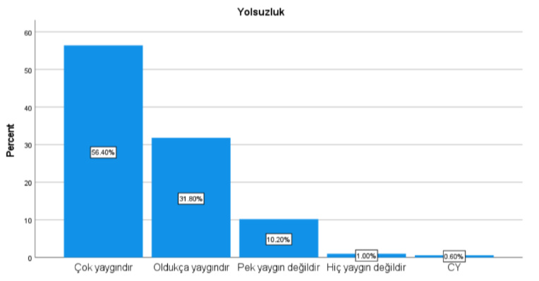 Ankete katılanların yüzde 87.80’i ülkede adaletsizliğin yaygın olduğunu, yüzde 88’i partizanlığın yaygın olduğunu, yüzde 88.2’si yolsuzluğun yaygın olduğunu ve yüzde 81’i de rüşvetin yaygın olduğu görüşünü bildirdi.