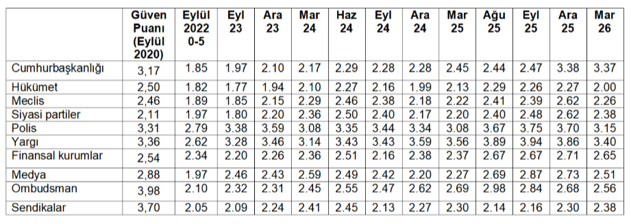Toplumun en çok güven duyduğu 3 kurum sırasıyla yargı, cumhurbaşkanlığı ve polis olurken, en az güven duyulan kurumlar hükümet, meclis ve siyasi partiler/ sendikalar oldu.
