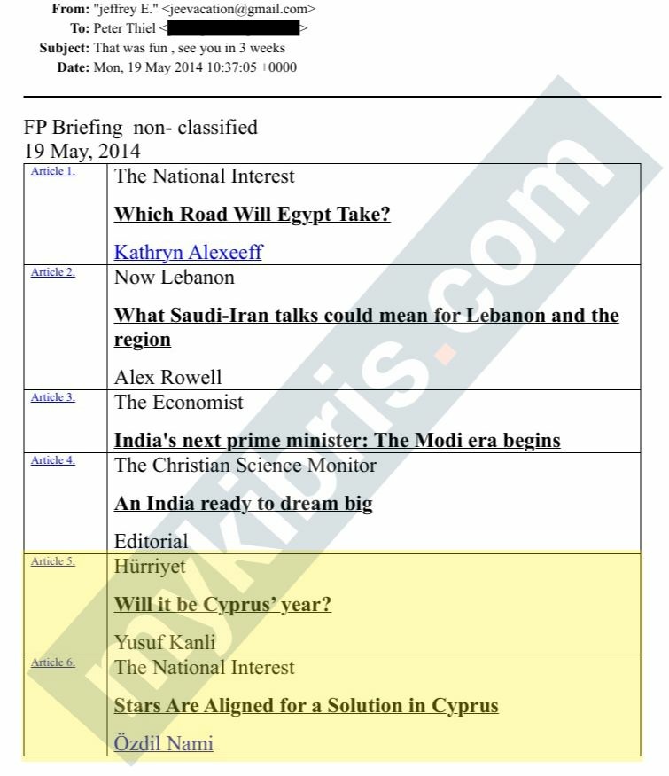 Belgeler arasında, 19 Mayıs 2014 tarihinde Epstein’ın milyarder girişimci Peter Thiel’e gönderdiği e-posta dikkat çekti. E-postada, Epstein tarafından derlenen ve “gizli olmayan dış politika brifingi” olarak tanımlanan çok sayıda uluslararası analiz yer aldı.