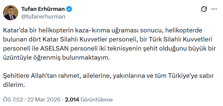 Erhürman, sosyal medya hesabından yayımladığı mesajda, Katar’da bir helikopterin kaza-kırıma uğraması sonucu helikopterde bulunan dört Katar Silahlı Kuvvetler personeli, bir Türk Silahlı Kuvvetleri personeli ile ASELSAN personeli iki teknisyenin şehit olduğunu büyük bir üzüntüyle öğrendiğini belirtti.