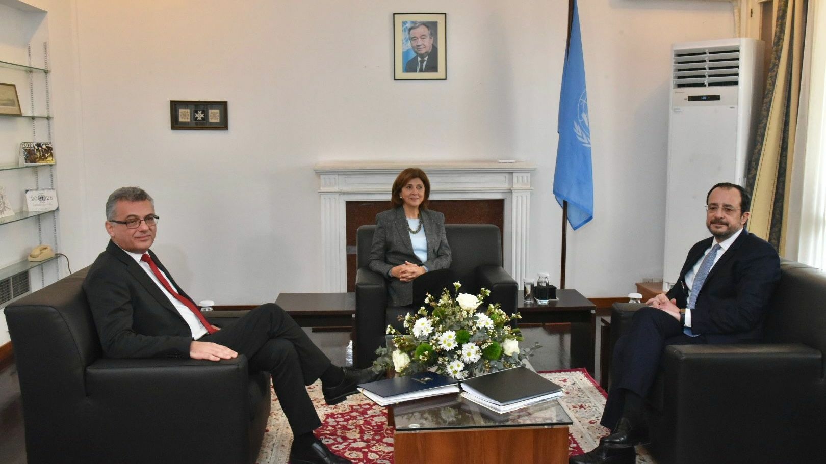Cumhurbaşkanı Tufan Erhürman ve Rum Lider Nikos Hristodulidis’i, BM Genel Sekreteri’nin Kıbrıs Kişisel Temsilcisi Maria Holguin ile BM Genel Sekreteri’nin Kıbrıs Özel Temsilcisi ve BM Barış Gücü Misyon Şefi Khassim Diagne karşıladı.