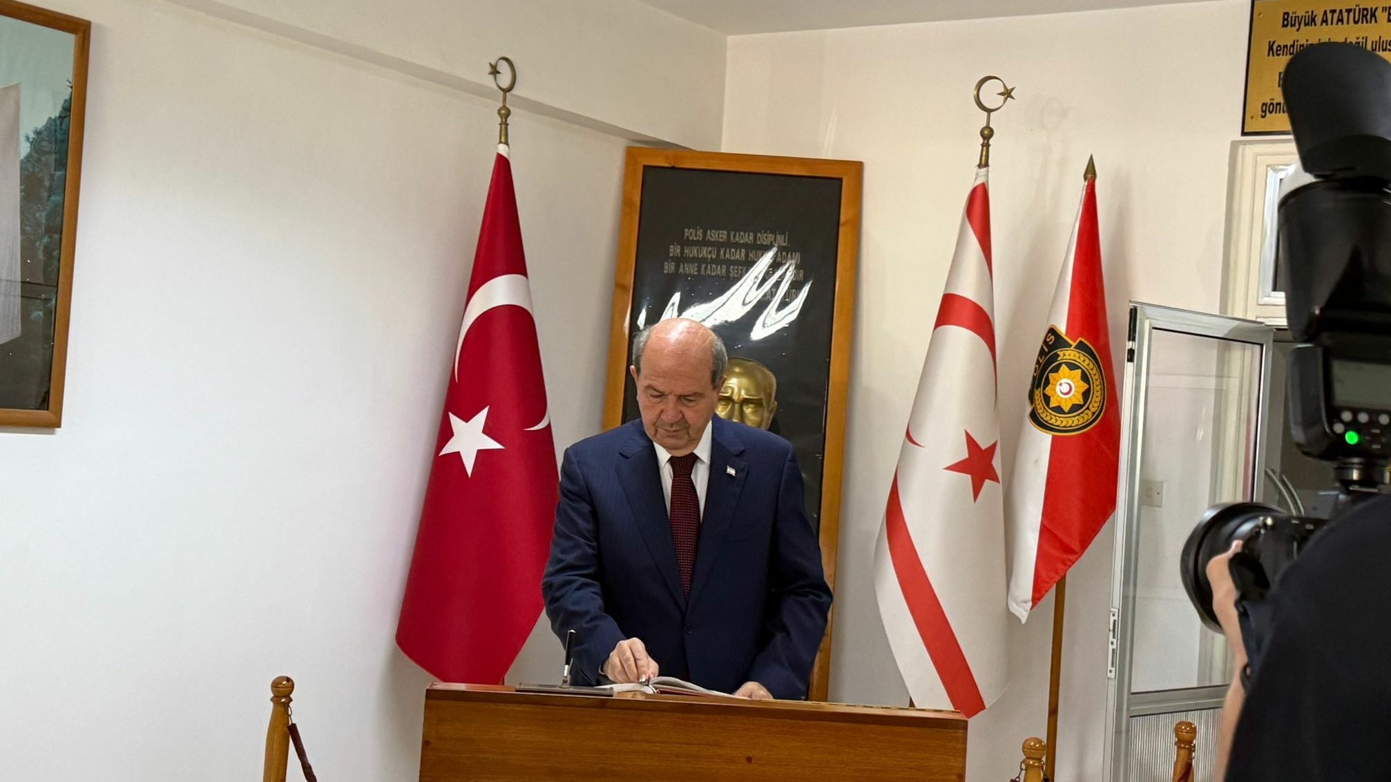 Girne Polis Müdürlüğü’ne gelişinde önce anı defterini imzalayan Ersin Tatar, müdürlükteki birimleri ayrı ayrı ziyaret ederek, personelle sohbet etti.