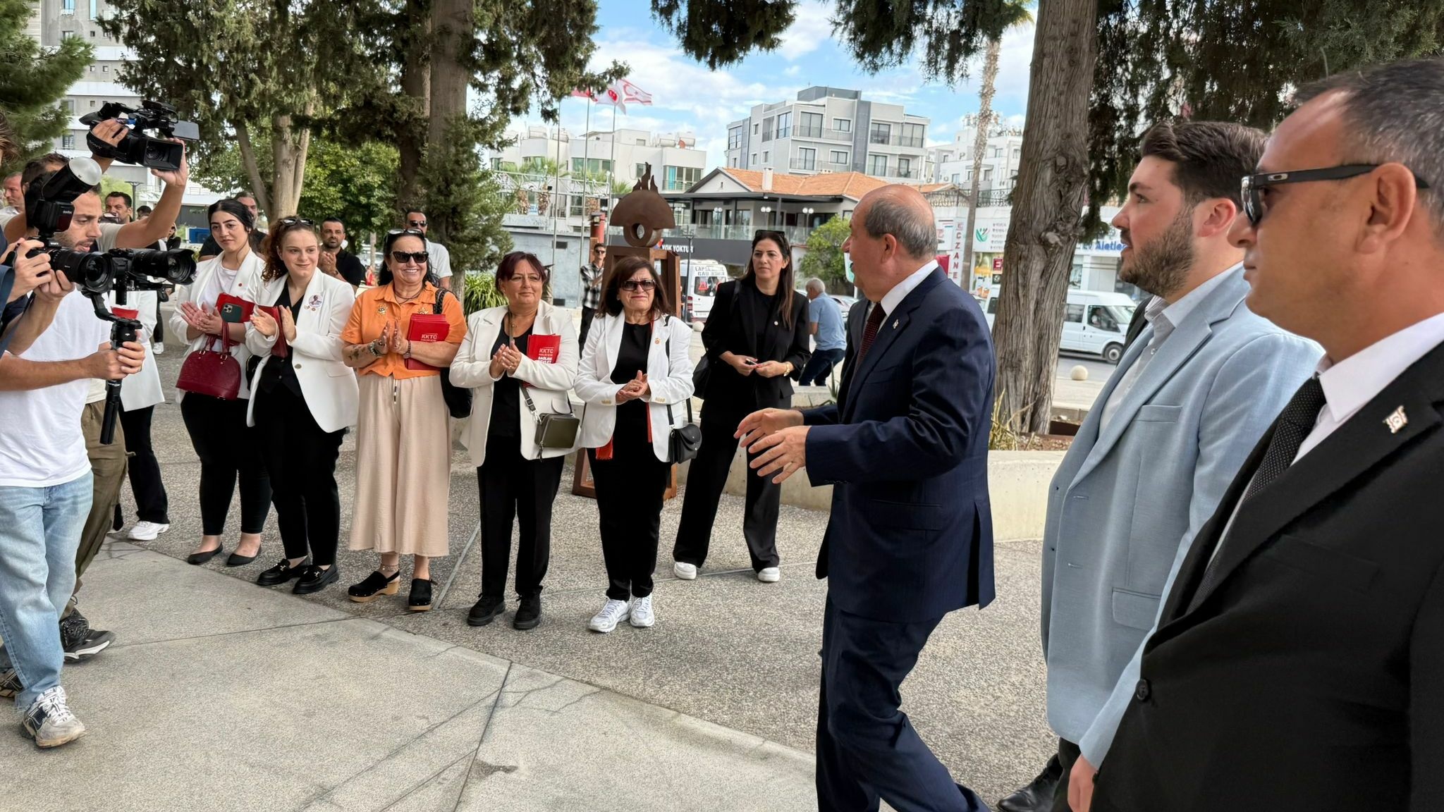 UBP Girne İlçe Kadın Kolları görevlileri, belediyenin önünde Tatar’ı bir koridor halinde alkışlayarak karşıladı.